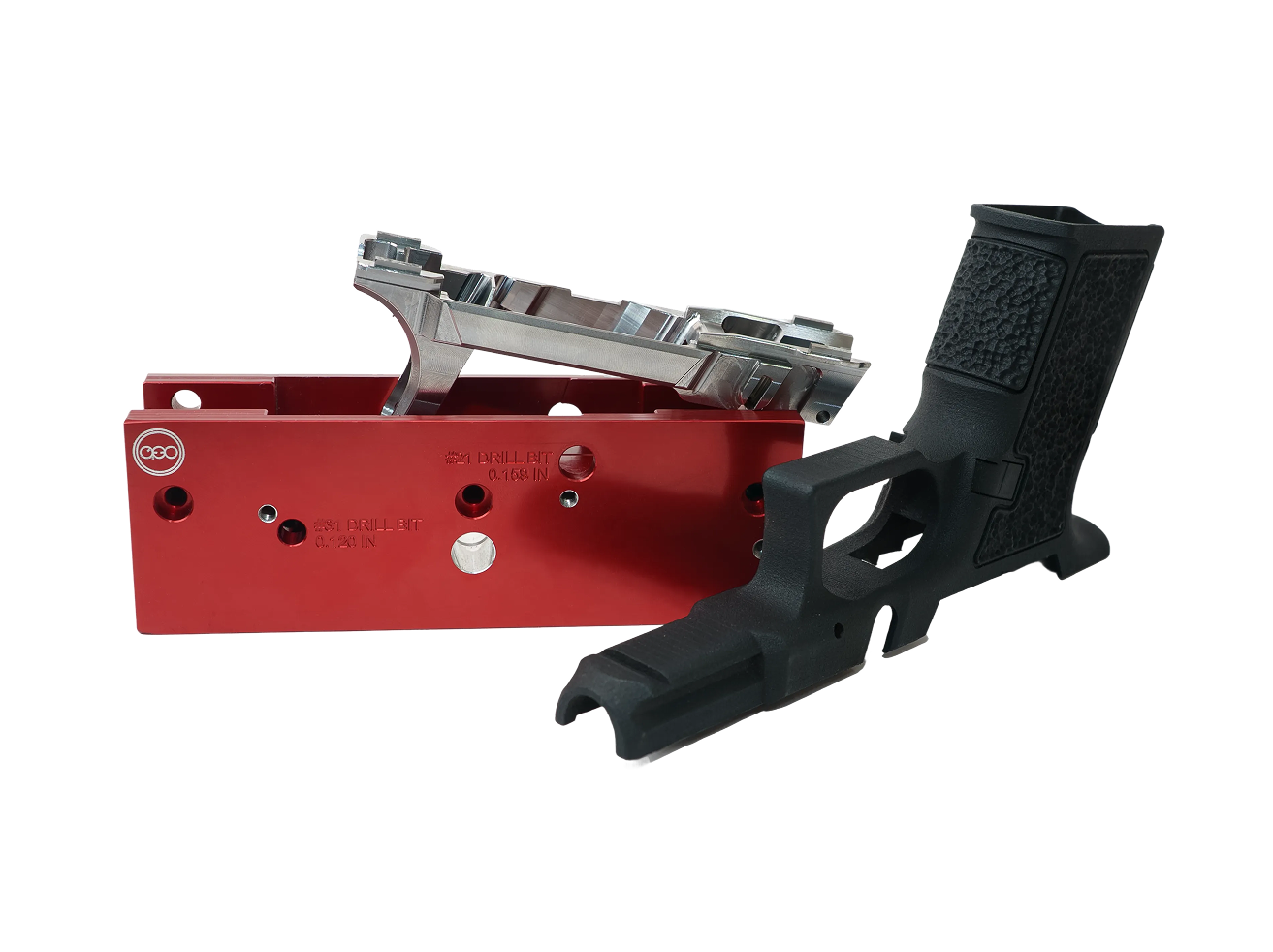 The custom-engineered jig system that guides you through completing your receiver with precision. CNC-machined aluminum construction holds tolerances across multiple builds. Works with Dremel rotary tools (Manual) or Ghost Gunner GG3-S (Machine). Includes: jig hardware set, 2x 3.1mm drill bits, 1x 4.1mm drill bit, 1x large grinding stone. Everything you need to go from unfinished to functional.